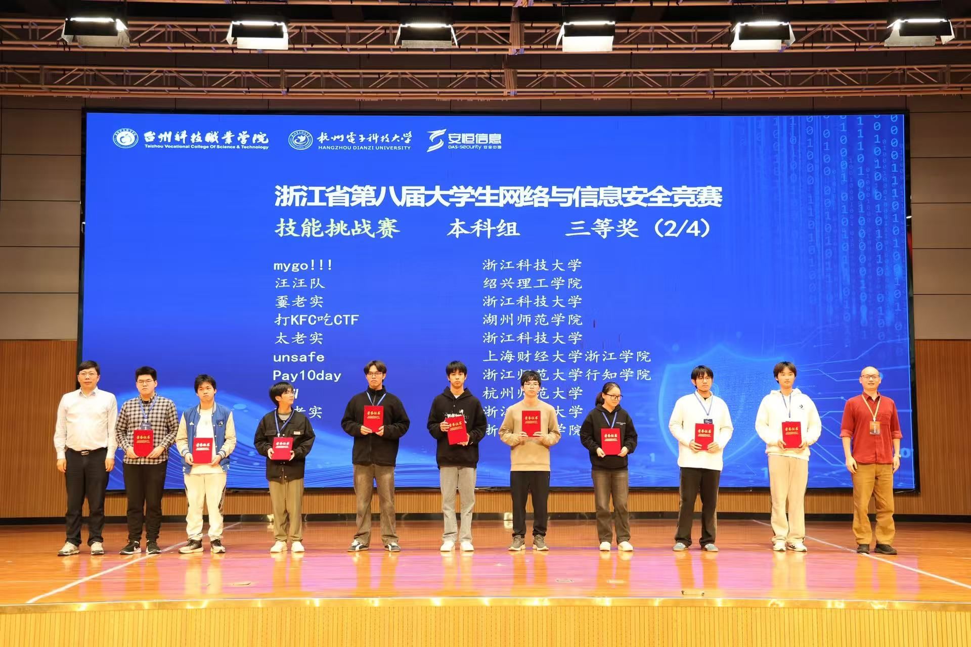 11月15日,浙江省第八届大学生网络与信息安全竞赛决赛在台州科技职业学院圆满落幕,我院学子凭借卓越表现斩获佳绩,共荣获四项省级奖项,其中包括两项一等奖,创下历史新高。