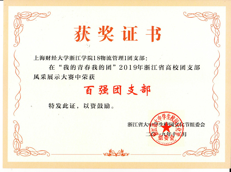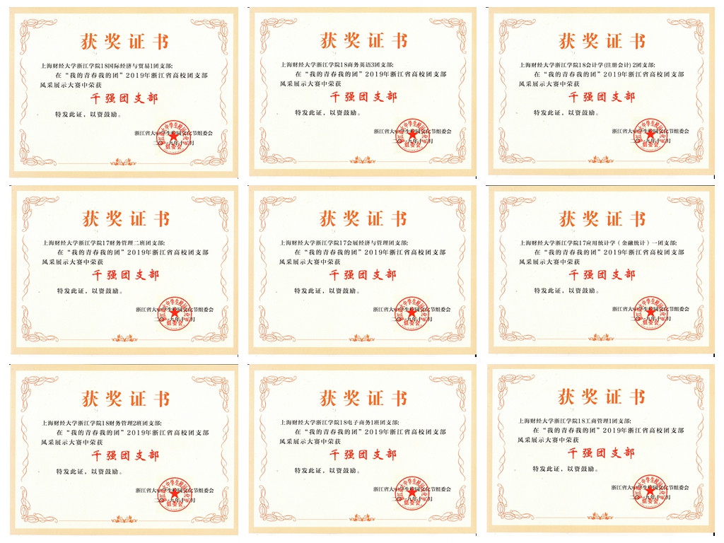 近日,“我的青春我的团”2019 年浙江省高校团支部风采展示大赛结果公布,经系、院、省层层遴选,我院18物流管理1团支部获浙江省“百强团支部”荣誉称号,17应用统计学(金融统计)1团支部、18财务管理2团支部、17财务管理2团支部、18会计学(注册会计)2团支部、18工商管理1团支部、18国际经济与贸易1团支部、17会展经济与管理1团支部、18电子商务1团支部、18商务英语3团支部等9个团支部获浙江省“千强团支部”荣誉称号。