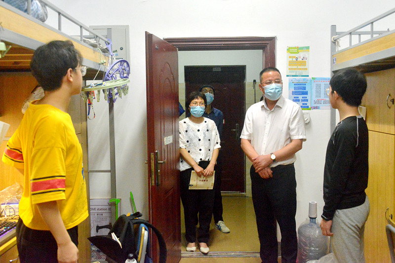 “同学们是从哪里出发来学校的?”“是乘坐公共交通工具回校的吗?” “回校途中紧张吗?有没有做好个人防护措施?”党委书记王建新一行来到3幢学生宿舍,看望了返校学生,详细了解了学生返校后的情况,对大家普遍关注的外卖送餐、快递收取、健身运动以及理发等问题逐一作了解答,并提醒同学们返校后及时向家人报平安。大家对学校的疫情防控和开学准备工作表示满意,特别是学校老师提前帮助同学们晒被子,做好寝室消毒通风工作,让大家倍感亲切。王建新叮嘱同学们要注意饮食营养均衡,保持作息规律,增强身体素质,平时在宿舍里要注意勤通风,同时希望同学们在疫情防控期间认真遵守学校相关规定,理解、支持学校各项工作,有任何困难及时反馈,多与班主任、辅导员沟通交流,对学校工作多提建议,学校也将尽最大努力满足同学们的要求。