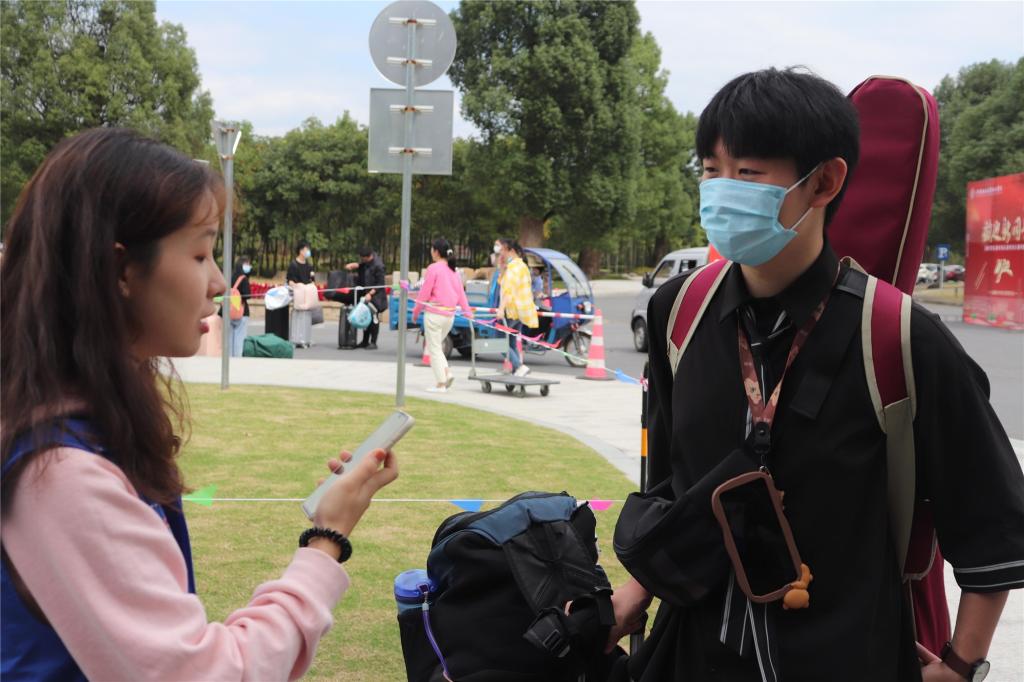 背着吉他,手拖行李箱的一位新生出现在校门口,他是2020级市场营销专业的耿同学。由于父母工作忙碌,他选择独自一人从西安坐火车来到金华。他说这是值得纪念的几小时,是自己送给自己的一份成人礼。“学校的面积比想象中大得多,并且十分干净整洁。”这是他对学校的第一印象。耿同学对丰富多彩的大学生活满怀期待,对接下来的生活也做好了规划。为了继续发展自己的兴趣爱好,他打算参加学校社团,来提升自己的吉他水平、夯实自己的舞蹈功底。