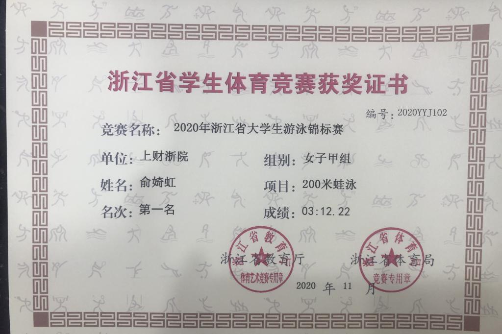 11月13日上午,2020年浙江省大学生游泳锦标赛暨第十四届全国学运会游泳选拔赛在杭州师范大学举办。比赛中,我院工商管理系俞婍虹同学顽强拼搏,荣获女子甲组个人200米蛙泳第一名、100米蛙泳第六名的好成绩。