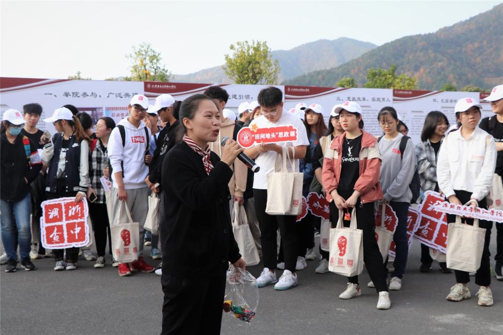 启动仪式开始前,曹宅镇鹤岩山村党支部书记戚根顺、上财浙院马克思主义学院教师李宛荫分别以“美丽乡村建设在鹤岩山村的实践”、“乡村振兴离不开习俗文化的传承与发展”为主题给同学们上了一堂别开生面的“田间地头”思政课。