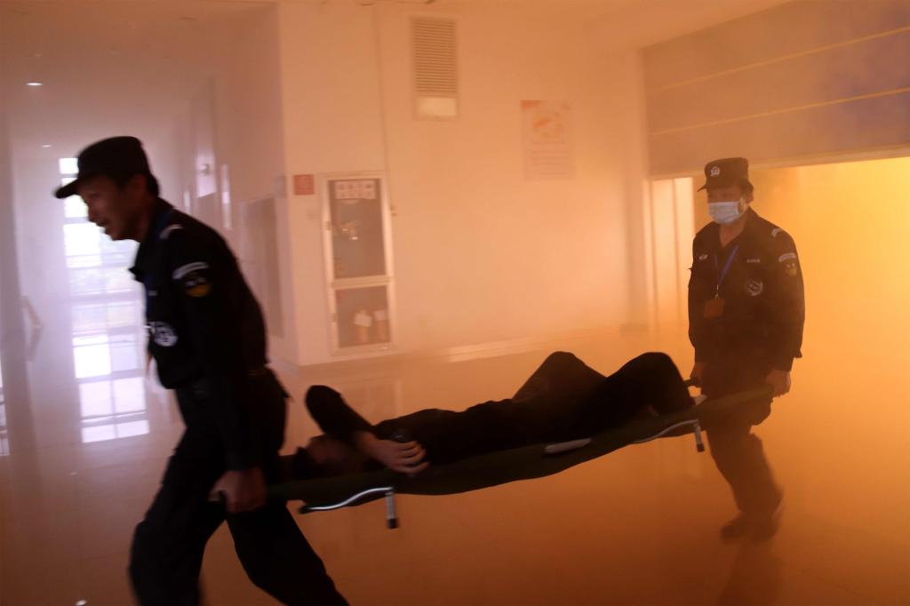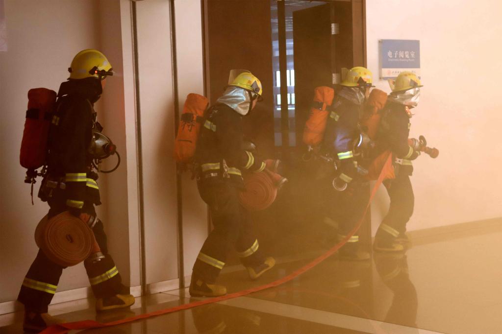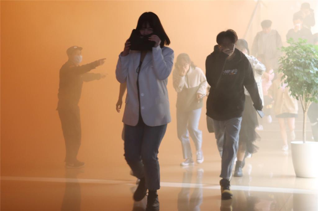 12时30分,学院党委书记王建新下令演练开始。顷刻间,现场“浓烟四起、警铃大作”,工作人员发现警情后立即向校保卫处和119报警,校内消防队伍迅速带上灭火器材赶赴起火地点进行扑救。与此同时,学生在疏散引导员的指引和带领下按要求迅速有序撤离。随后,防火卷帘门等自动化消防设施启动,“火灾现场”进一步得到有效控制。此时,绝大多数同学都在第一时间被疏散到安全场所,但高楼层仍有被困人员等待救援,消防队员迅速组织救援行动,现场指挥人员通过监控定位人员位置并发送给消防队员,消防队员精准快速地实施了搜救。通过紧张的救援,消防人员用担架成功将被困学生救出,外部云梯消防车也将被困高楼层的两名学生救出。