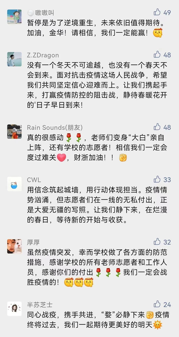 万众一心,共克时艰,拨开疫情阴霾,见得复苏天日。相信在全体金华市民的携手抗疫下,在全体财浙人的共同努力下,定能早日抗疫成功,恢复正常校园生活。
