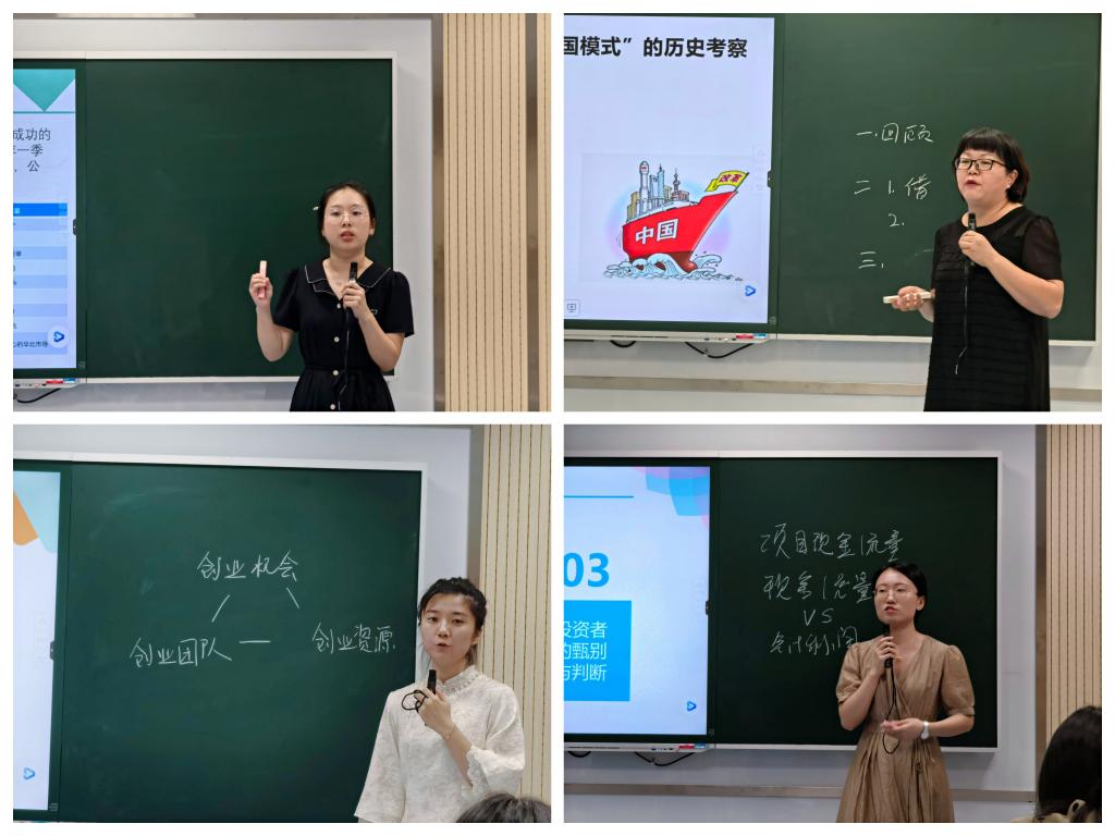 比赛现场,参赛选手各展所长精彩纷呈。从以叮咚买菜为例的存货相关成本概念到制度博弈中坚定地发展社会主义再到现实资源整合的创新创业基础,各具特色的授课内容充实而又生动。青年教师们激昂澎湃地授课展现了作为学生人生领路人的教育热忱,将思政教育以润物细无声的方式融入课堂教学,不仅传授知识,也将正确的价值观、人生观潜移默化地传递给学生。短短20分钟的教学展示融合了价值塑造、能力培养和知识传授,多维度呈现了我院青年教师的教学水平。