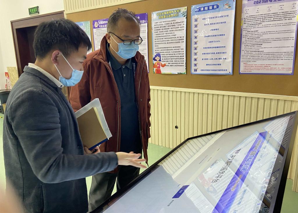 熊璞详细汇报了图书馆2022年度资源建设、读者服务、馆舍优化、安全管理、智慧图书馆等相关工作情况,并重点介绍了本年度图书馆“考研加油站”建设项目的完成情况。马洪在听取相关工作汇报后,实地走访了“考研加油站”,并仔细询问了解“考研加油站”的有关情况,在“考研资讯区”,马洪仔细查看了研究生招生、复习备考、讲座信息等相关资讯;在“考研资源区”,马洪翻阅了图书馆为考研读者免费提供的历年真题等考研复习资料;在“考研留言区”,马洪勉励考研读者积极迎考,增强考研信心。