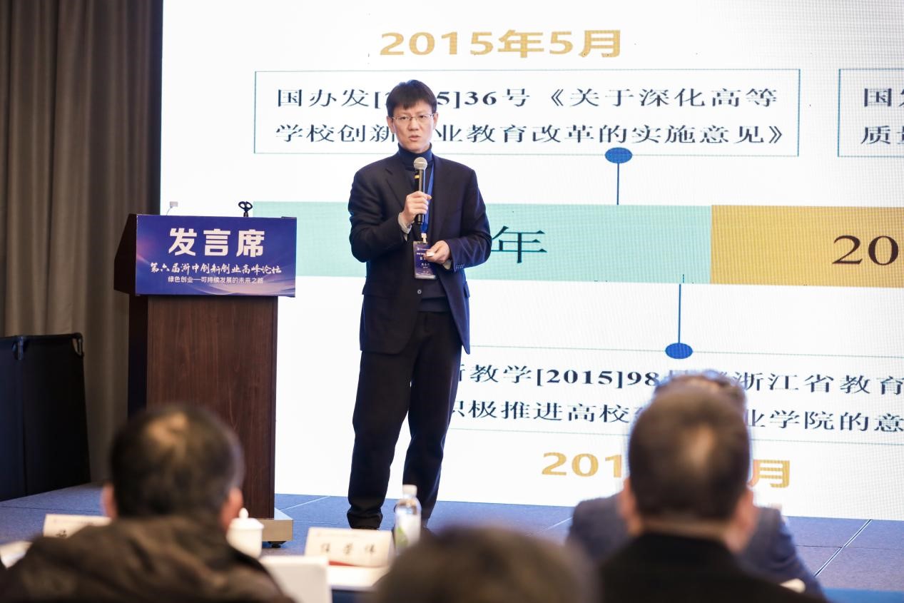 院长马洪致开幕词。马洪为参会嘉宾们介绍了我院近年来在创新创业教育上的发展成果,并表达了学院将继续以创新为主题的期许,关注时代发展新趋势,通过绿色创业践行新时代的发展理念,通过校企合作、资源共享以及数字融合来推动绿色创业的发展,为浙中地区发展贡献力量。