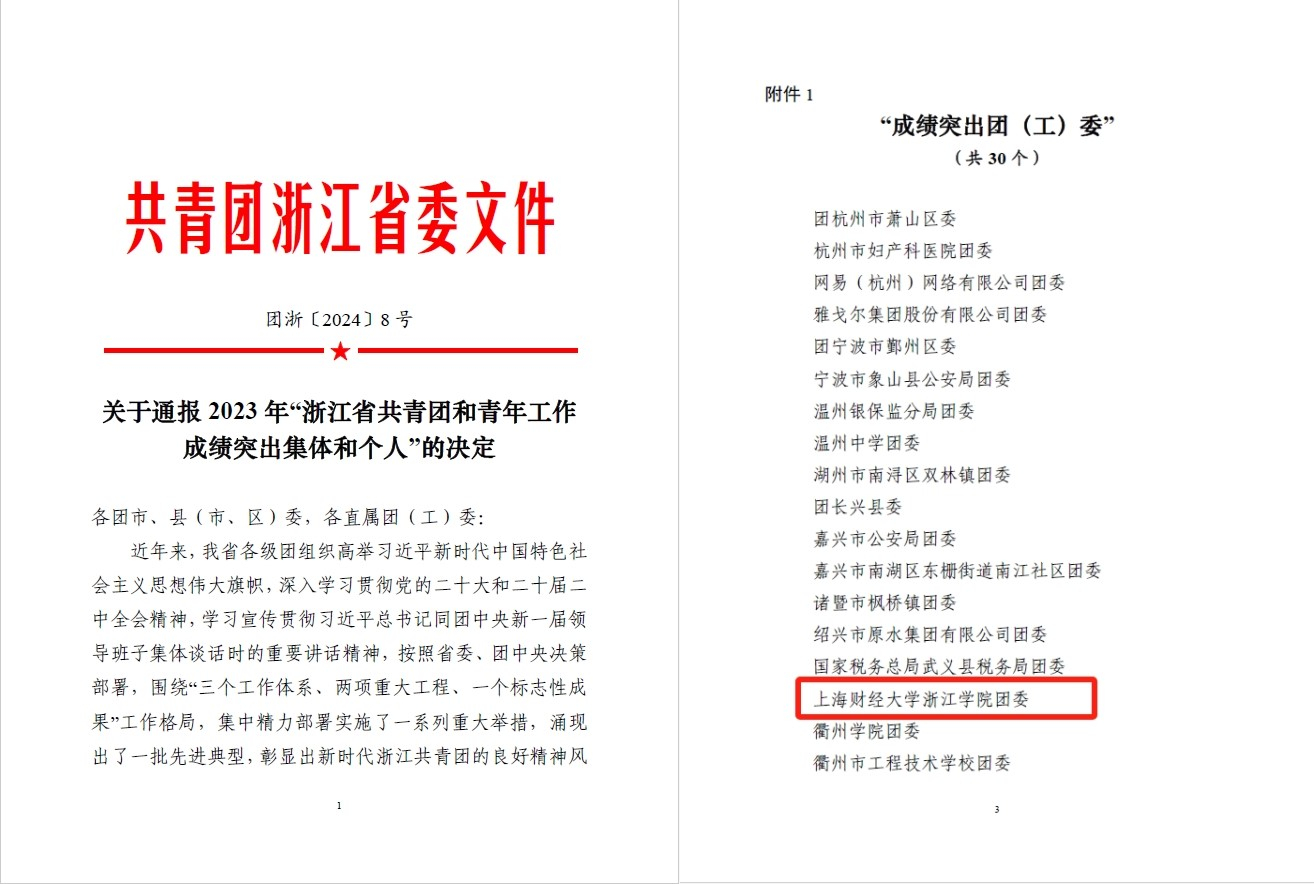 近日,为表彰先进、树立典型,进一步发挥典型示范引领作用,共青团浙江省委对2023年“浙江省共青团和青年工作成绩突出集体和个人”提出表扬。其中,开云手机入口团委获评“浙江省成绩突出团(工)委”,全省共30个团(工)委获此殊荣。