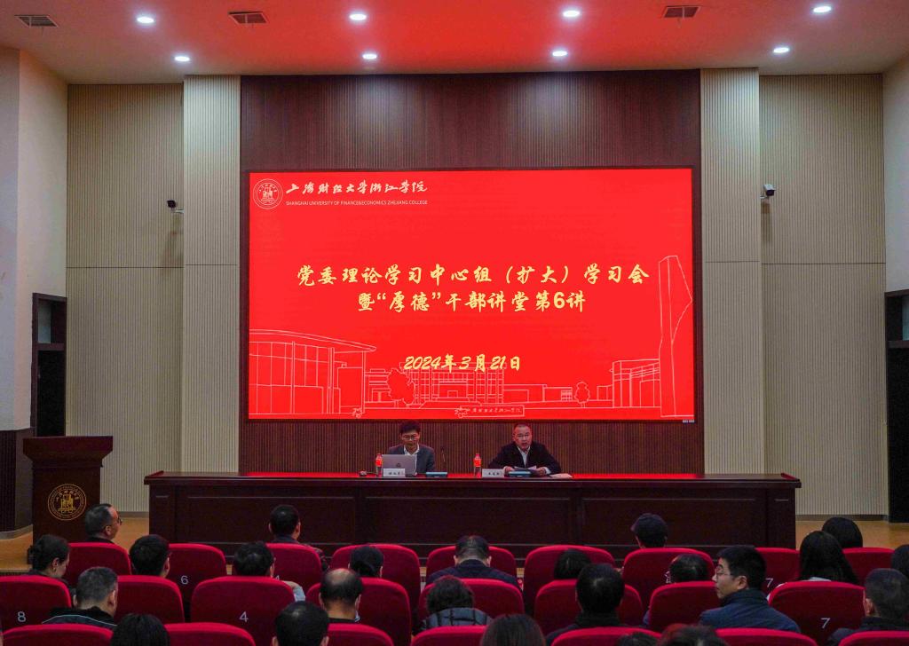 3月21日晚上,学院召开党委理论学习中心组(扩大)专题学习会暨“厚德”干部讲堂第6讲,传达贯彻全国两会精神、深入学习习近平总书记关于发展新质生产力的重要论述。会议邀请上海财经大学中国经济思想发展研究院副院长陈旭东作“准确把握新质生产力内涵,着力推动经济高质量发展”的专题辅导报告。党委书记王建新主持并讲话。