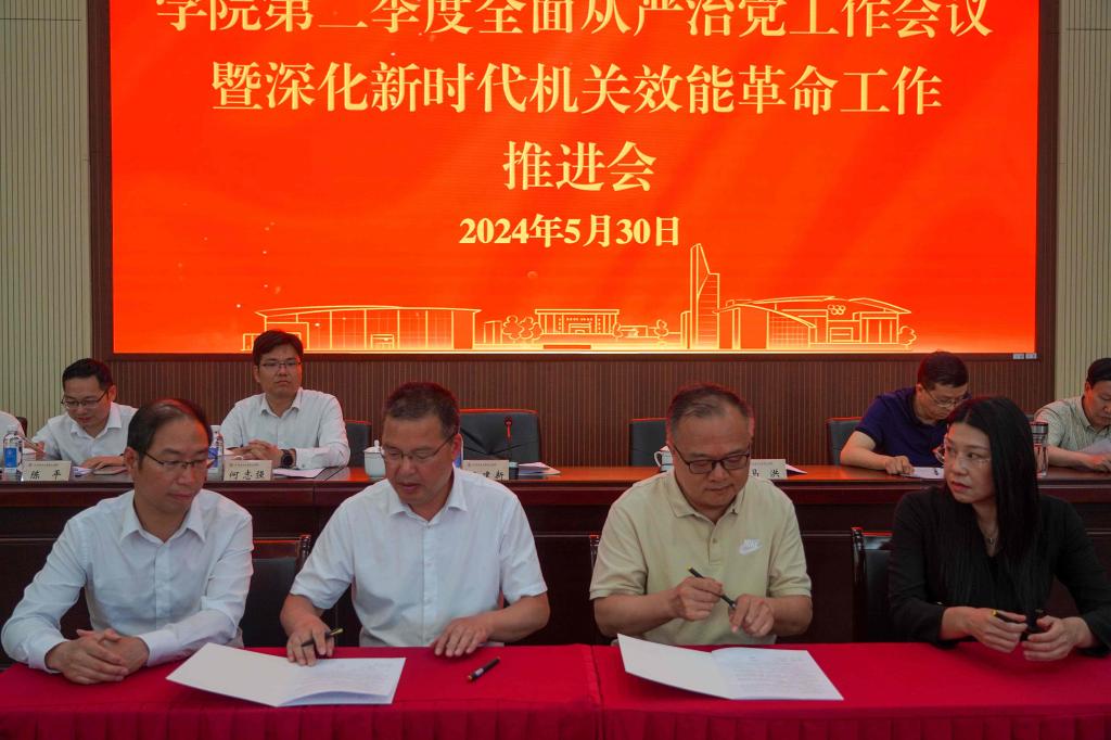 5月30日下午,学院在行政楼120报告厅召开2024年第二季度全面从严治党暨深化新时代机关效能革命工作推进会。学院党委书记王建新主持会议并作党纪学习教育专题党课,学院领导班子成员、全体中层干部、系(部)综合办主任、学工办主任、专兼职纪检人员参加会议。