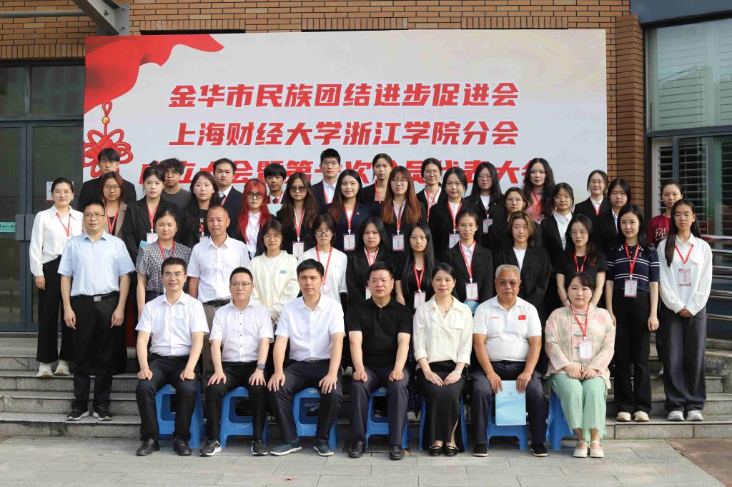 金华市委统战部副部长朱鹏对分会的成立表示祝贺,指出民族进步促进会肩负重要使命,接下来,要在学校党委领导下,紧扣教育教学中心工作,通过开展形式多样、助力学校发展与民族团结的特色活动,以实干实效彰显组织价值;要强化责任担当,筑牢民族团结思想根基;还要发挥桥梁作用,促进各民族交往交流交融;更要服务中心大局,提升组织凝聚力影响力。学院党委副书记杨喆俊指出,分会的成立是学院贯彻落实中央民族工作会议精神、深化民族团结进步教育的重要举措。他强调,学院始终坚持以铸牢中华民族共同体意识为主线,将民族团结进步教育融入立德树人全过程。学院将全力支持分会工作,充分发挥高校资源优势,一是要强化思想引领,创新开展民族团结主题教育,打造财浙特色品牌项目;二是要深化服务赋能,构建民族学生成长平台,营造 “中华民族一家亲” 校园氛围;三是要聚焦理论研究,围绕民族工作热点课题攻坚,以高质量成果赋能地方发展。