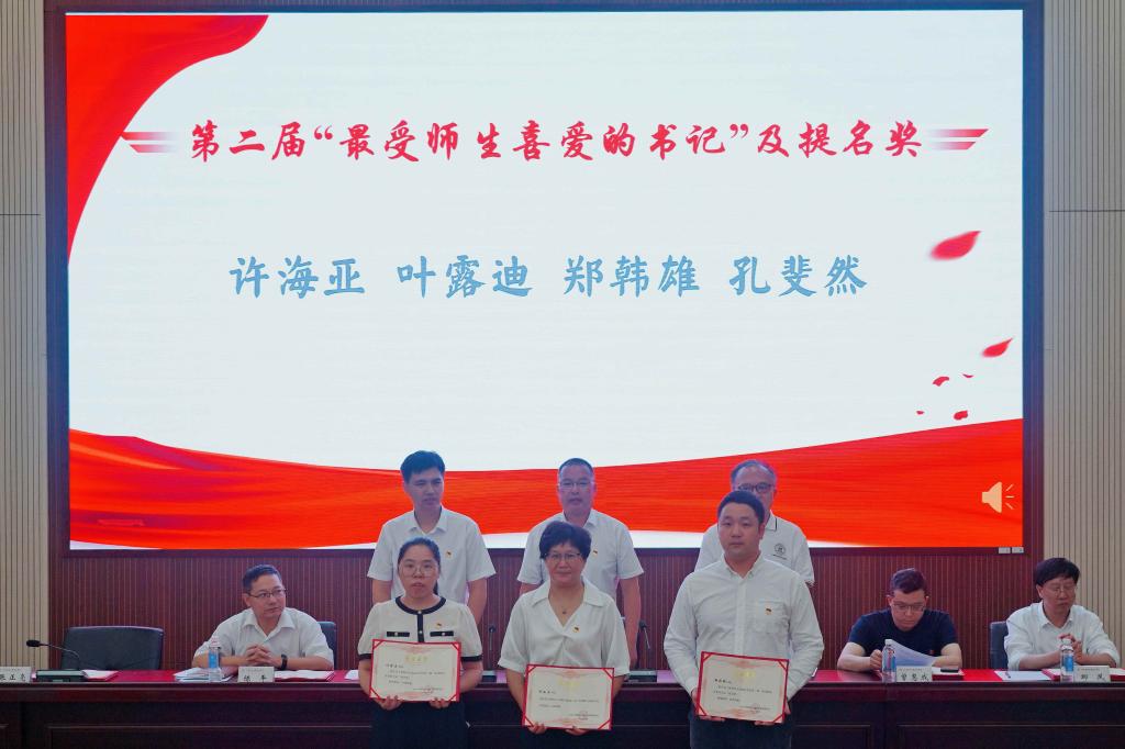 党委副书记杨喆俊宣读了相关表彰决定。许海亚同志获评第二届学院“最受师生喜爱的书记”,叶露迪等3名同志获评第二届学院“最受师生喜爱的书记”提名奖;外语系党总支等8个党组织获评先进基层党组织;陈芳等53名同志获评优秀共产党员;吴文茹等23名同志获评优秀党务工作者。