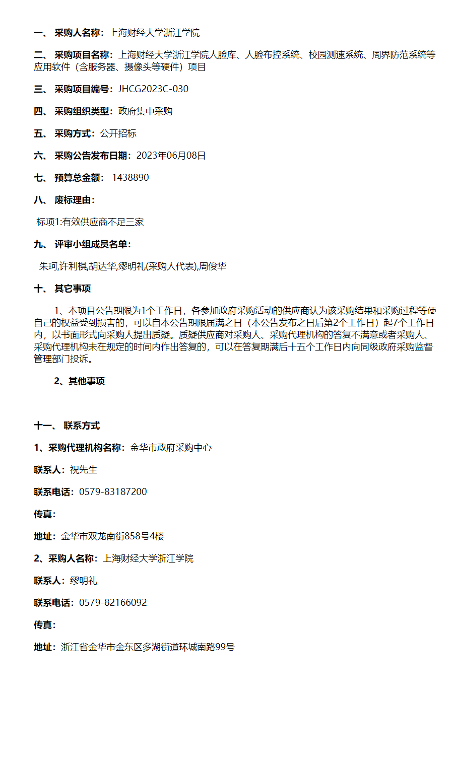 【废标公告】金华市政府采购中心关于开云手机入口人脸库、人脸布控系统、校园测速系统、周界防范系统等应用软件(含服务器、摄像头等硬件)项目废标公告