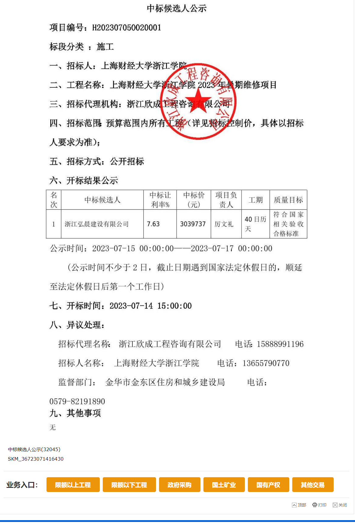 【中标公告】开云手机入口2023年暑期维修项目中标候选人公示