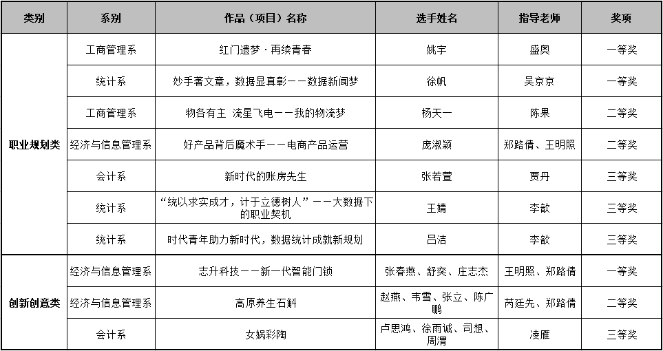 每位参赛选手陈述完毕后,各评委老师进行了提问或点评,指出了作品(项目)当前存在的问题,并提出优化意见和建议。经过近三个小时的激烈角逐,评委们评选出职业规划类一等奖两项、二等奖两项、三等奖三项;创新创意类一、二、三等奖各一项。