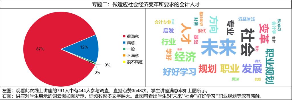 此次系列讲座是会计系新生入学教育的首次创新尝试,对新生初步了解大学生活、尽快适应大学学习、树立学习信念都起到了良好的促进作用。此次讲座总计吸引了2394人次观看,得到新生的一致好评。