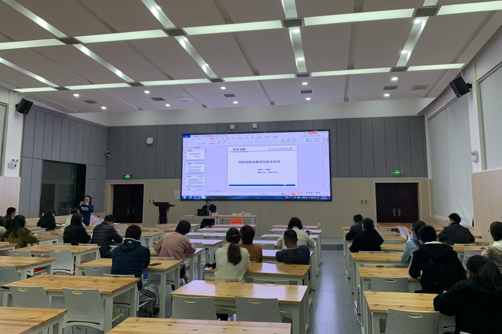4月14日晚,金华市财政局采购监管处处长杨震东来我校作政府采购法的解读,就政府采购法律法规、采购中的关键环节进行讲解与经验分享。讲座由公共管理处负责人主持,全体中层干部,各系综合办、学工办主任及各部门采购联络人参加。