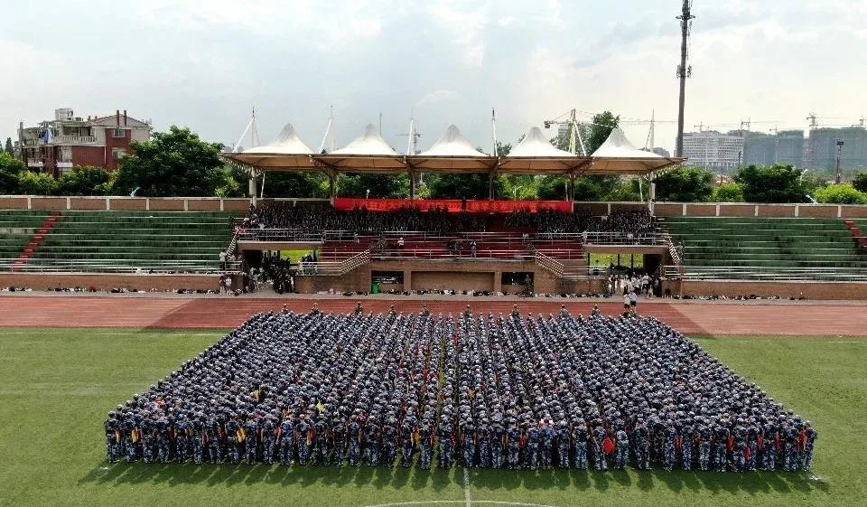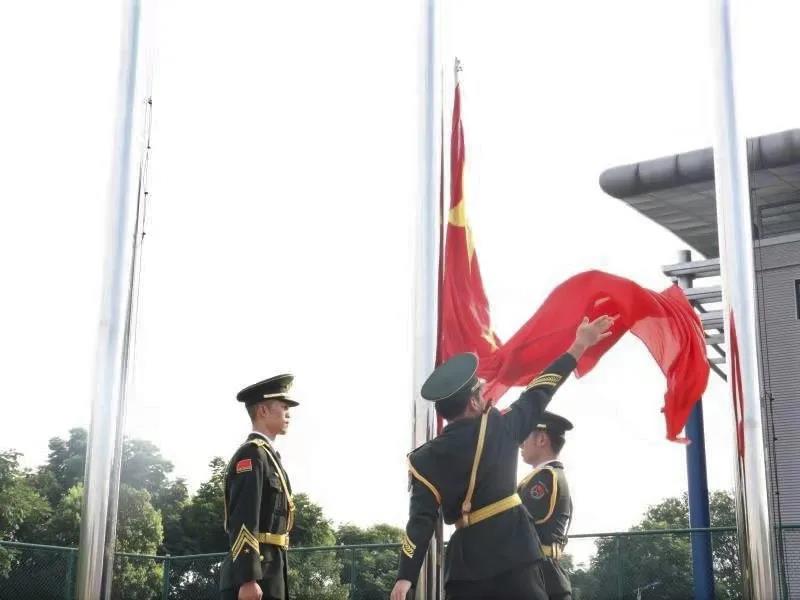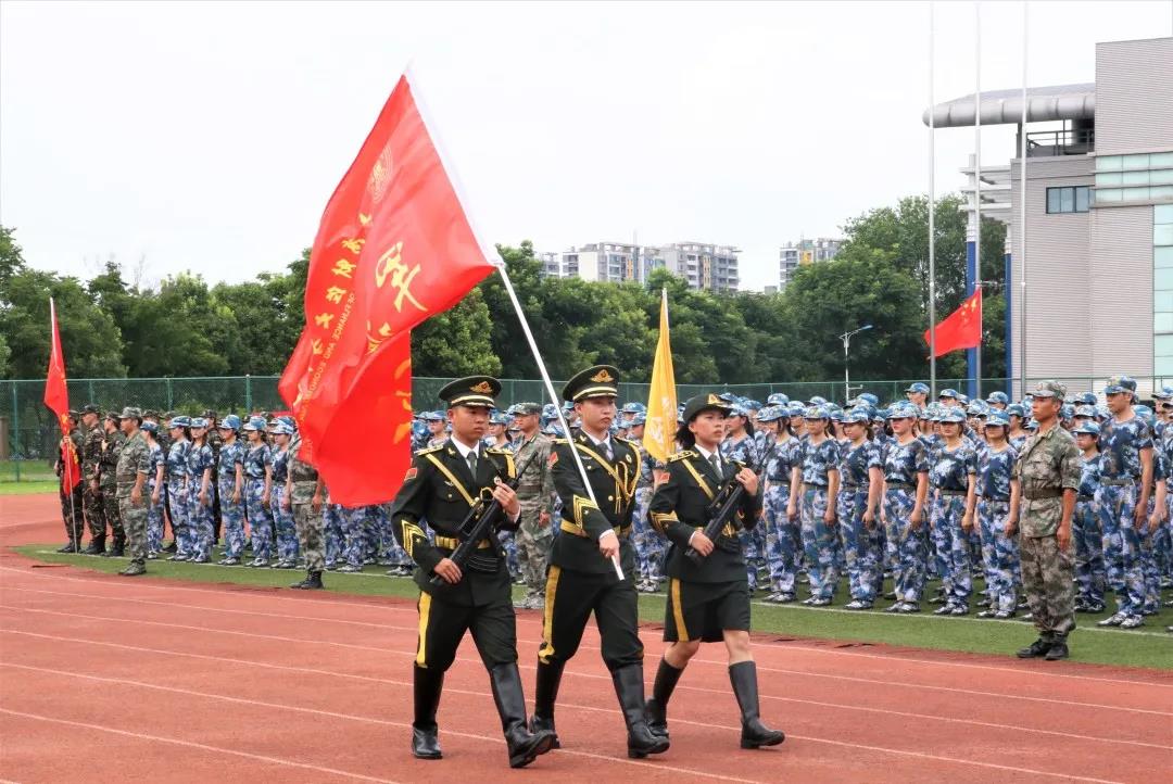 在雄壮的国歌声中,国旗徐徐升起,军训汇报表演正式拉开帷幕。