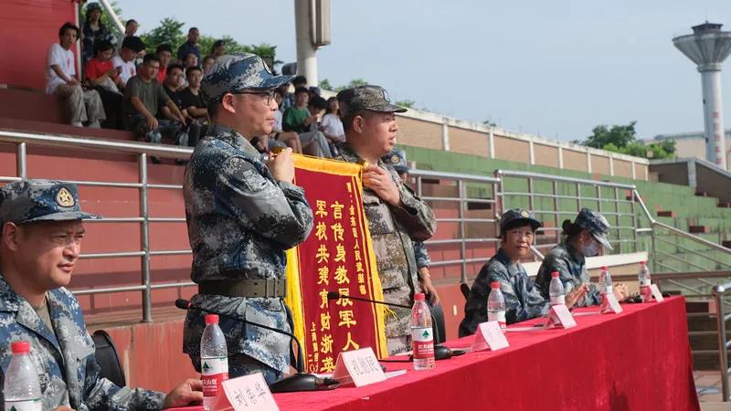 金东区人武部军事科科长徐奇宣读了军训“优秀方阵”和“先进个人”嘉奖令主席台上领导们为获奖方阵颁发锦旗。