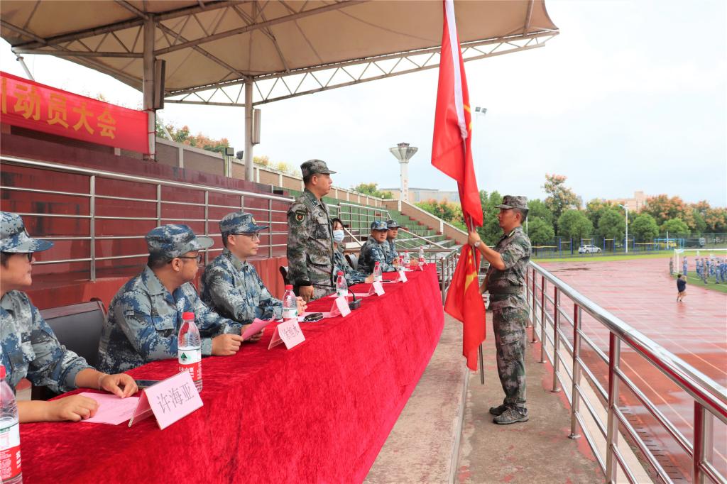 最后,徐奇为学院2021级新生军训大队授旗。动员大会圆满落幕,1500余名新生正式开始军训。青春无畏烈日,磨砺不惧汗水。相信财浙学子会秉承“自强不息”的精神,通过军训磨炼顽强意志、塑造健全人、增强国防观念,用汗水奏响大学生活第一曲,踏上大学生活新征程。