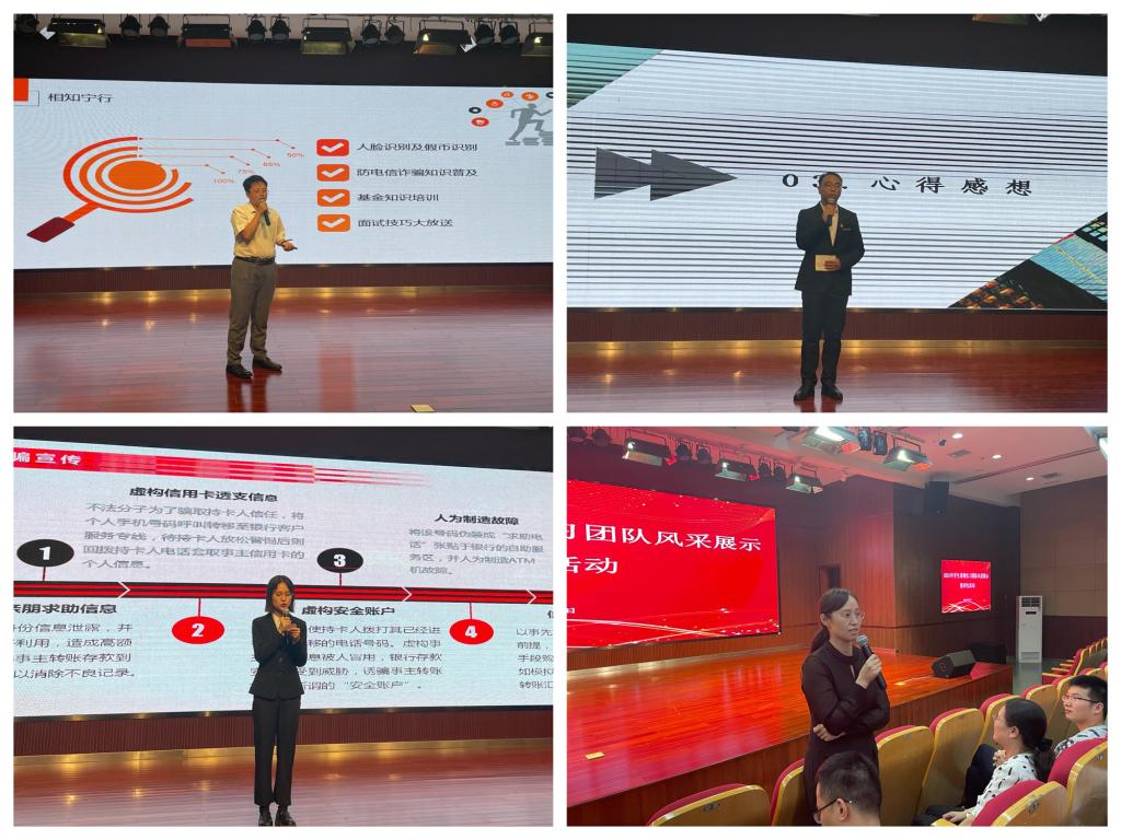 本次活动共有5支团队参与展示评比,分别是在宁波银行金华分行实习的“宁行家”团队、在浙江泰隆商业银行金华分行实习的“勇敢隆隆队”团队、在上海申威联合会计师事务所实习的“财浙申威事务所审计小组”团队、在中国建设银行金华分行实习的“牛牛队”团队、在中国工商银行婺城支行实习的“工行小分队”团队。每支团队先以PPT、微视频等形式,从实习单位概况、实习过程、实习总结、实习感受等方面向大家充分展现各自暑期实习成果。“宁行家”团队分享了从实习初的忐忑到实习后的成长经历,介绍了参与过的团建活动及单位伙食,表达了经历实习体验后在学习、生活等方面的未来展望。“勇敢隆隆队”秉持“勇敢隆隆!不怕困难”初心分享了在大堂经理、营销等实习岗位的实习过程,感悟出“笃定、实干、敢闯、奉献”精神。“财浙申威事务所审计小组”概述了外勤、复核、工商、归档四类主要工作,分享了“实习价值远远高于实习价格”的宝贵经验,体现了严谨细致、客观公正的工作态度。“牛牛队”表示无论在哪个岗位实习,只有沉下心才能在工作中得心应手,更好的为广大客户带来方便、快捷、准确的服务。“工行小分队”结合实习目标与规划,在实习过程中探索工作技巧,端正实习态度,总结出多听、多看、多想、多学、多实践。