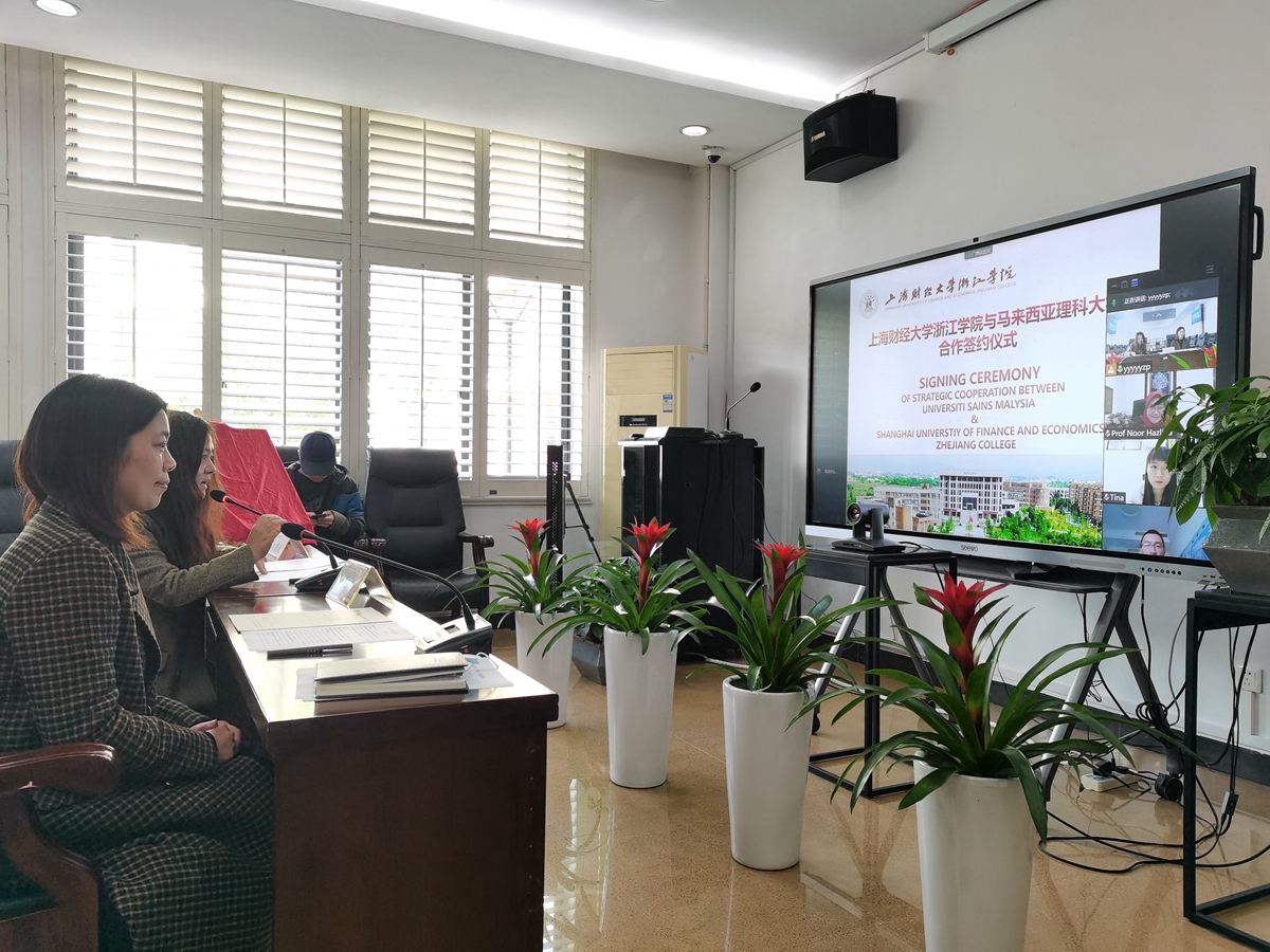 11月24日下午,学院与马来西亚理科大学两校合作签约仪式暨学院“一带一路”研究中心授牌仪式在行政楼28幢108会议室顺利举行。学院党委委员、统战部部长徐玉芳,学院人事处、国际交流合作处负责人,学院各系教师代表和学生代表,马来西亚理科大学管理学院院长努尔· 哈兹利娜·艾哈迈德,马来西亚理科大学航空航天工程学院代表及端深教育集团代表出席了仪式。由于疫情原因,马来西亚理科大学方及我院师生代表采用了在线视频会议形式。