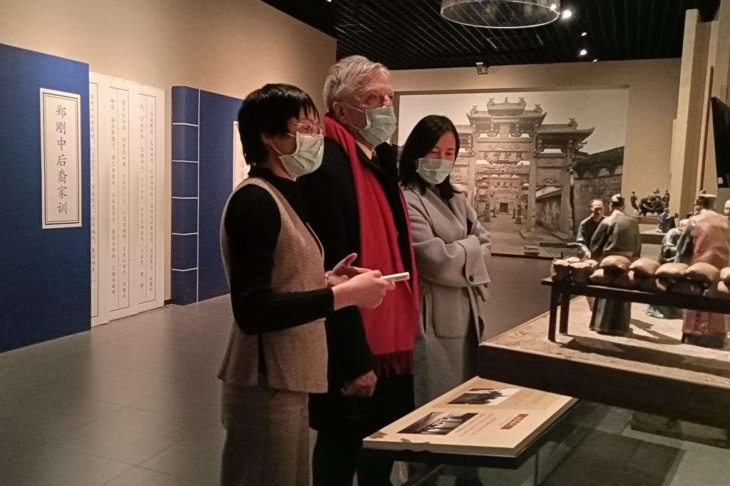 随着曹艳梅老师的生动讲解,大使先生被中国灿烂文明和八婺文化深深吸引。在参观过程中,大使先生对上山文化、中国传统习俗、婺风家训产生了浓厚的兴趣,不时在展台前停下脚步,认真观看展品,详细了解情况并提出问题,曹老师一一用英文给予详细介绍。