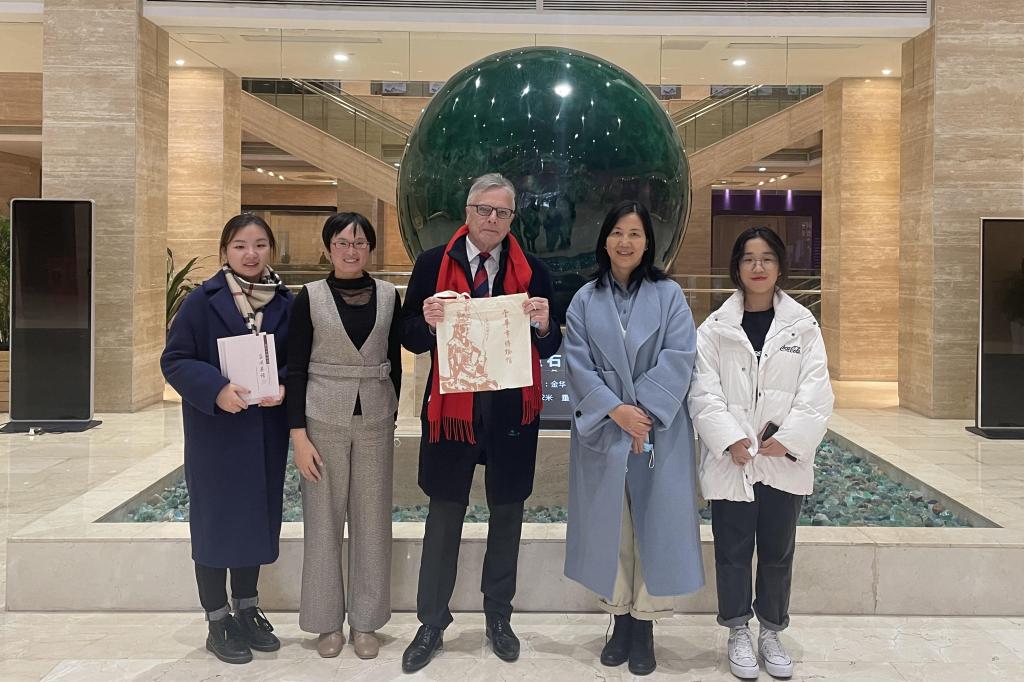 11月24日下午,我院外语系教师曹艳梅和LinkerS学生志愿者一起,在金华市博物馆为南非前驻外大使、南非国际关系与合作部欧美司原代理副总司长,格特·格勒布勒(Gert Grobler)讲述了金华的历史和文化。