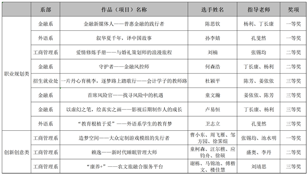 自2022年2月启动,经过近四个月的赛前指导、初赛、复赛和决赛四个阶段。决赛共25位参赛选手,经过选手们激烈的角逐和专家评委的认真评选,最终评选出职业规划类一等奖2名,二等奖2名,三等奖4名,创新创意类一、二、三等奖各1项。具体获奖名单见下图: