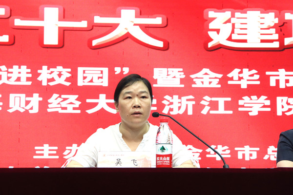 吴飞主席在致辞中强调举办“喜迎二十大 建功新时代”劳模工匠进校园活动旨在掀起金华市教育行业向劳动模范学习的新风潮。她强调坚持习近平新时代中国特色社会主义思想为指导,勉励广大教师向劳动模范与优秀同行对标看齐,进一步筑牢师德师风根基、弘扬劳模精神,为党育人、为国育才,为民族复兴贡献力量。
