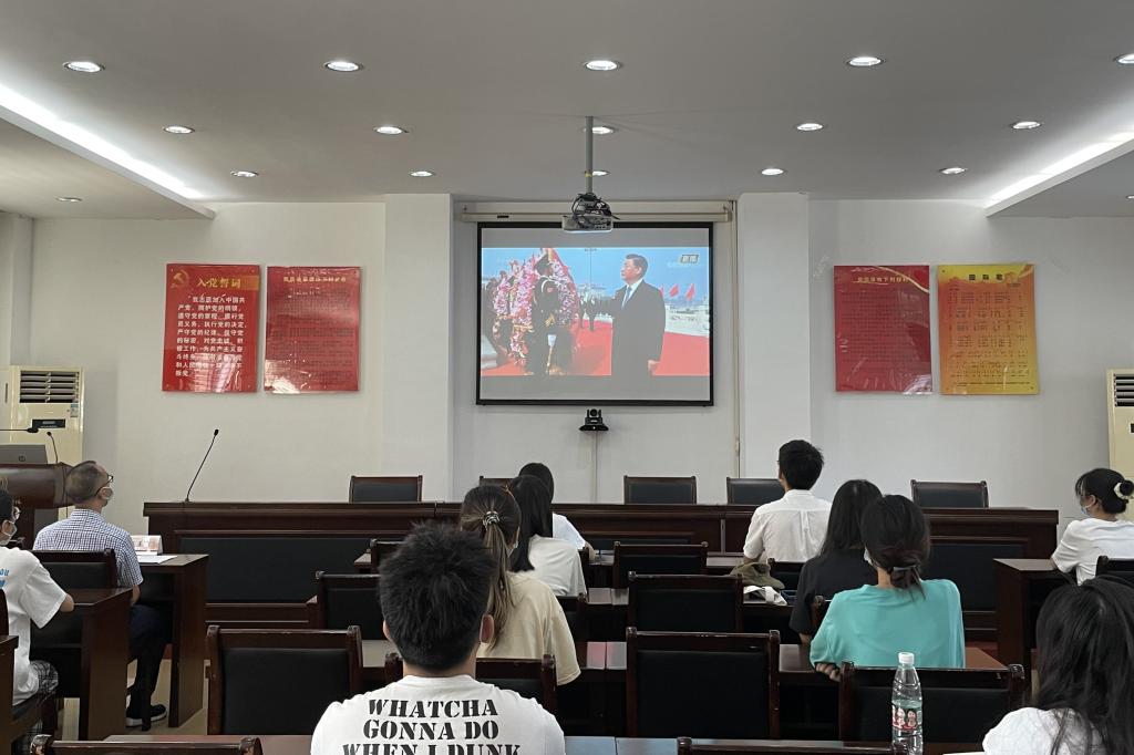 上午10点,习近平等党和国家领导人同首都各界代表一起,在天安门广场人民英雄纪念碑前,向人民英雄敬献花篮。观看仪式过程中,全体学生党员庄严肃穆,跟随直播画面起立默哀,深切缅怀为实现民族独立和复兴、为谋求人民解放和幸福、为创立新中国建设新中国而英勇牺牲的烈士们,接受了一场深刻的爱国主义教育。