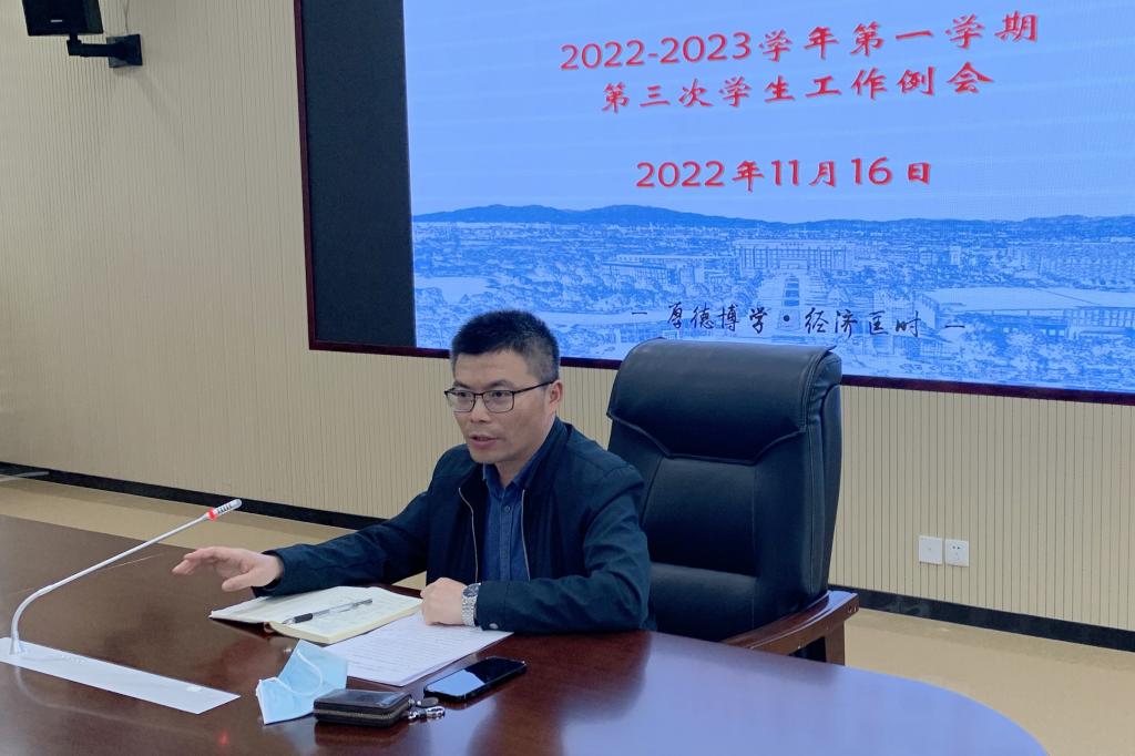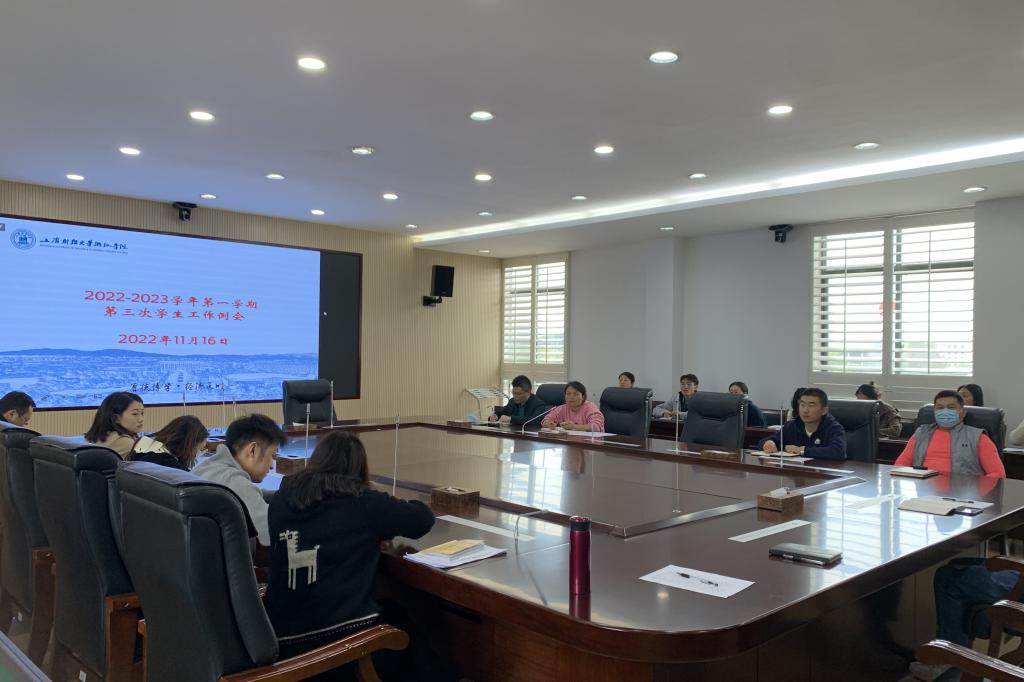 为做好省运会开幕式群众组织及近期学生管理工作,近日,学院召开本学期第三次学生工作例会。学院党委副书记孔德民出席,各系总支负责人、学工办主任、辅导员,学生处、招生就业处、团委等相关职能部门参加会议。会议由学生处负责人主持。