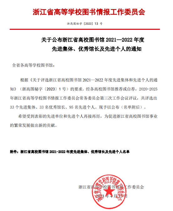 近日,浙江省高校图工委公布了2021-2022年度浙江省高校图书馆先进个人评选结果,学院图书馆张爱球老师荣获“浙江省高校图书馆2021-2022年度先进个人”称号。