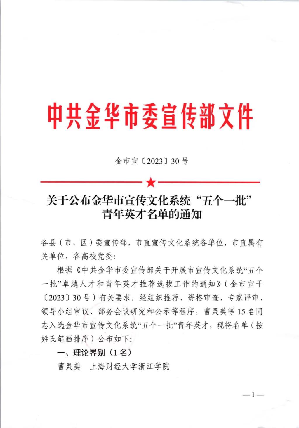 根据《中共金华市委宣传部关于开展市宣传文化系统“五个一批”人才和青年英才推荐选拔工作的通知》(金市宣干[2023]30号)的有关要求,经组织推荐、资格审查、专家评审、领导小组审议、部务会议研究和公示等程序,我院外语系曹灵美老师成功入选金华市宣传文化系统青年英才。