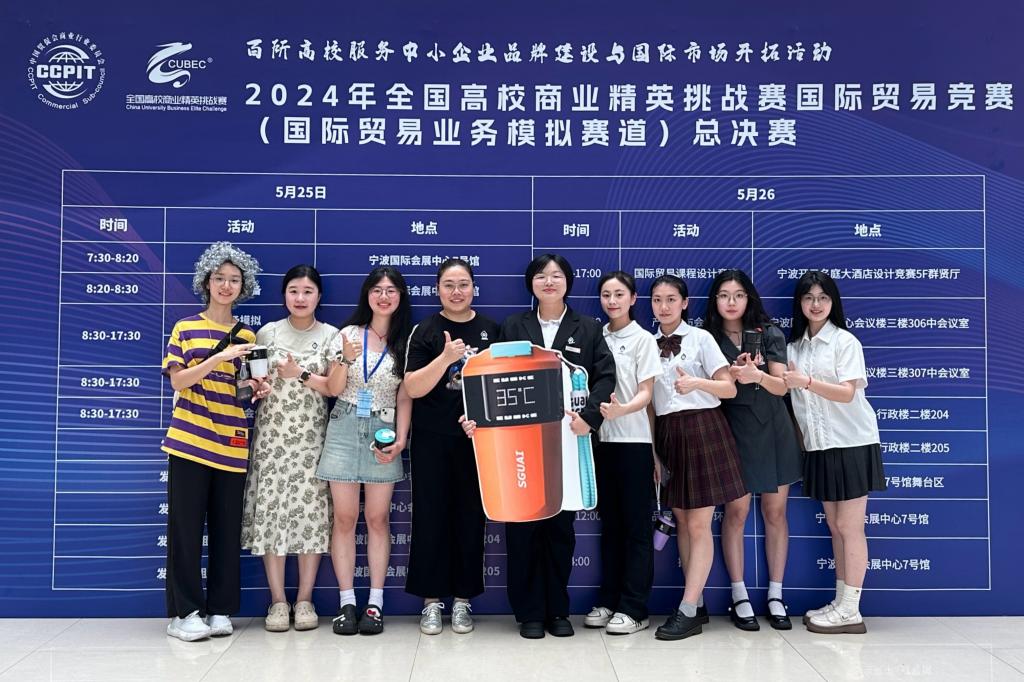 近日,第十四届全国高校商业精英挑战赛国际贸易竞赛总决赛落下帷幕。我院郭阳、伍懿、吴悠等八位参赛学生在刘靖思、姜艳艳老师的指导下,通过参展计划书(中文)、展位布置(现场搭建)、产品发布会(英文)以及商贸谈判(英文)四个环节的比拼,最终凭借参赛作品《小水怪(深圳)智能科技有限公司智能水杯》荣获全国一等奖。