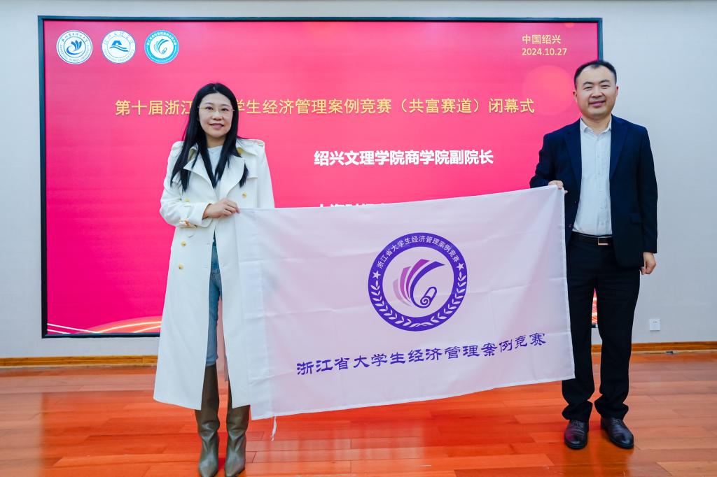 张慧忠代表学院参加本届竞赛闭幕式,李玫昌代表学院与绍兴文理学院进行“大学生经济管理案例竞赛(共富赛道)”承办权交接仪式即“赛旗交接仪式”。至此,2025年第十一届浙江省大学生经济管理案例竞赛(共富赛道)总决赛承办权正式移交给我院。